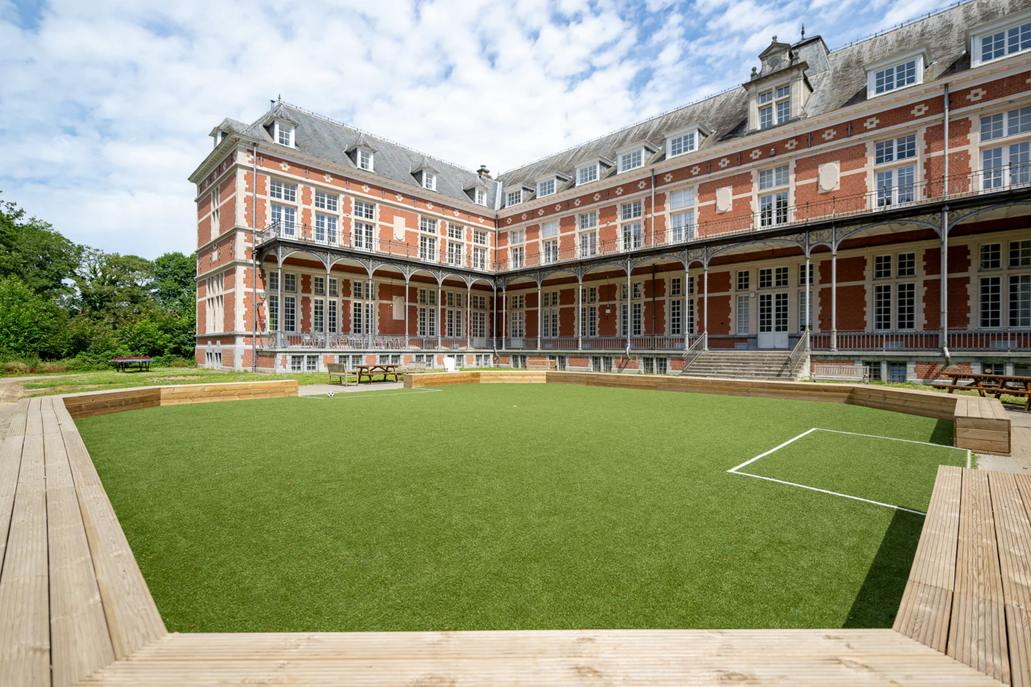 Een pannaveld omgeven door houten kooi, harmonieus geïntegreerd in de natuurlijke, groene omgeving. Waar ooit een vervallen, lege ruimte was, bruist het nu van leven, met jongeren die samenkomen en samen plezier maken.