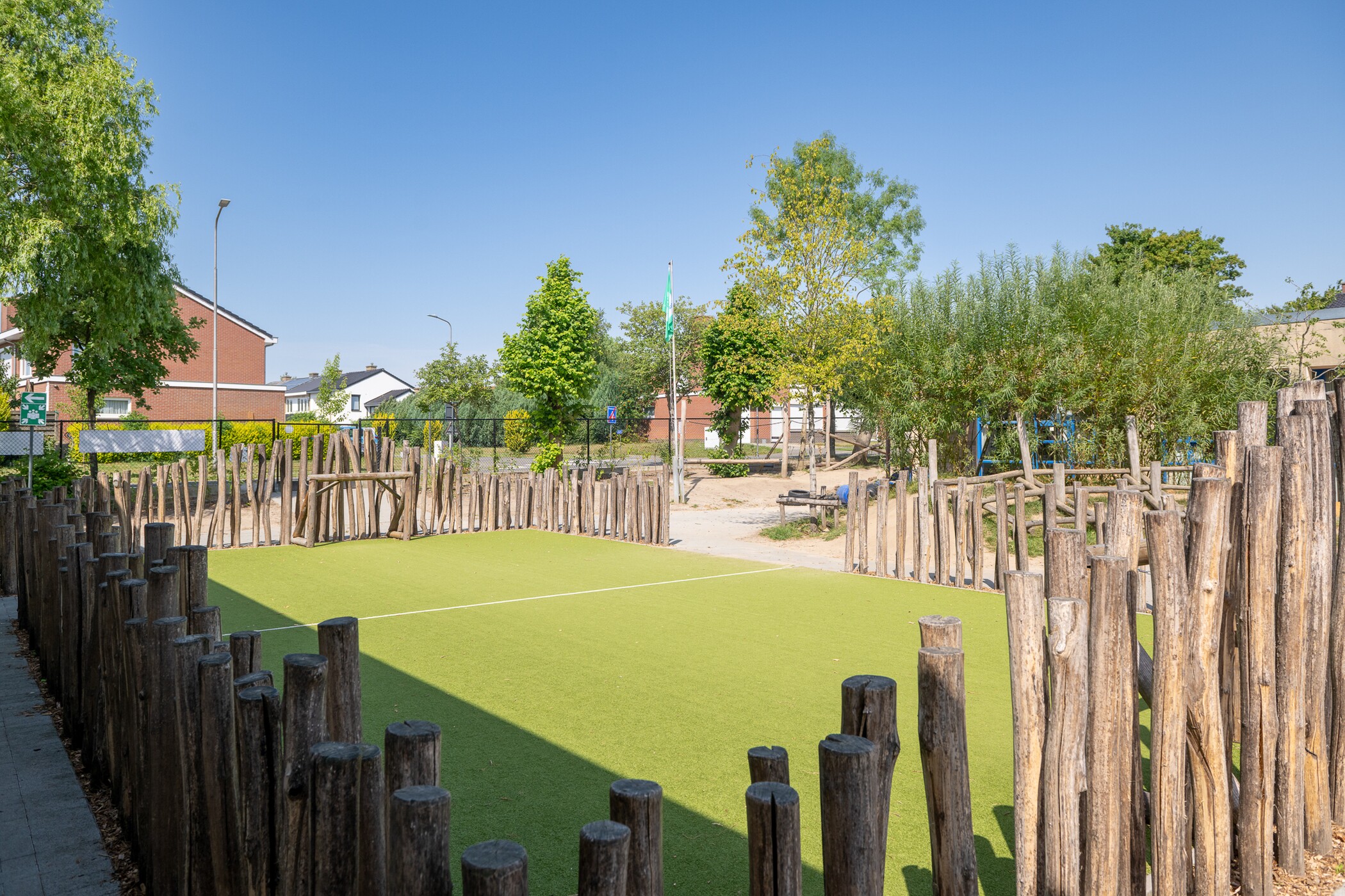 Een compact trapveldje met eenvoudige belijning (duidelijke middenlijn) zodat kinderen zonder beperking kunnen sporten. De natuurlijke houten omranding zorgt voor een warme uitstraling en vormt een creatieve, duurzame oplossing die perfect aansluit bij de reeds bestaande speelelementen.